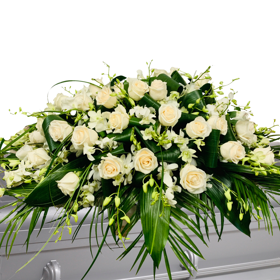 The composition of white Roses and white Dendrobium Orchids express a peaceful serenity with grace and elegance.