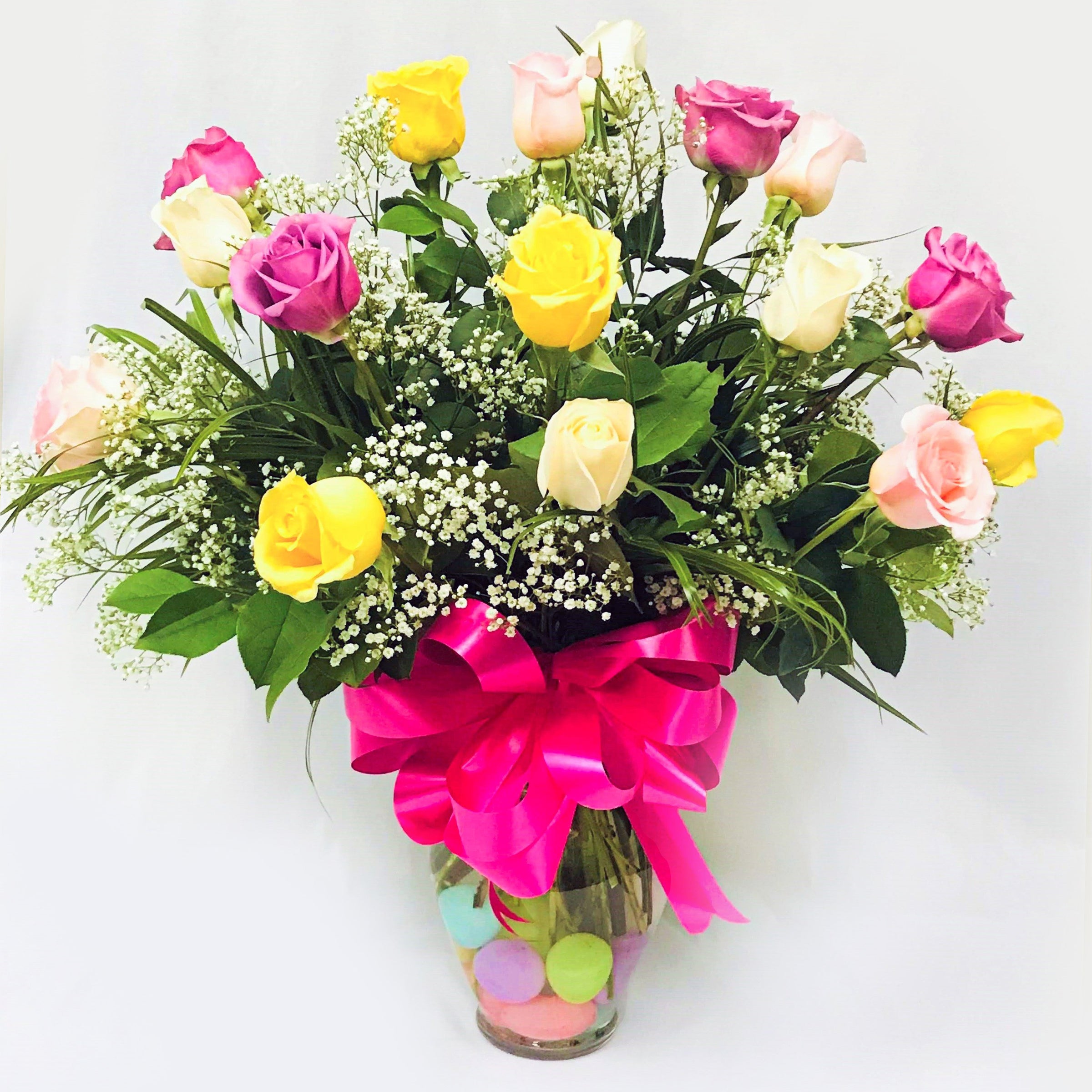 Easter Roses vase brings you 18 brightly colored roses accented with Easter eggs and a bright-colored bow.