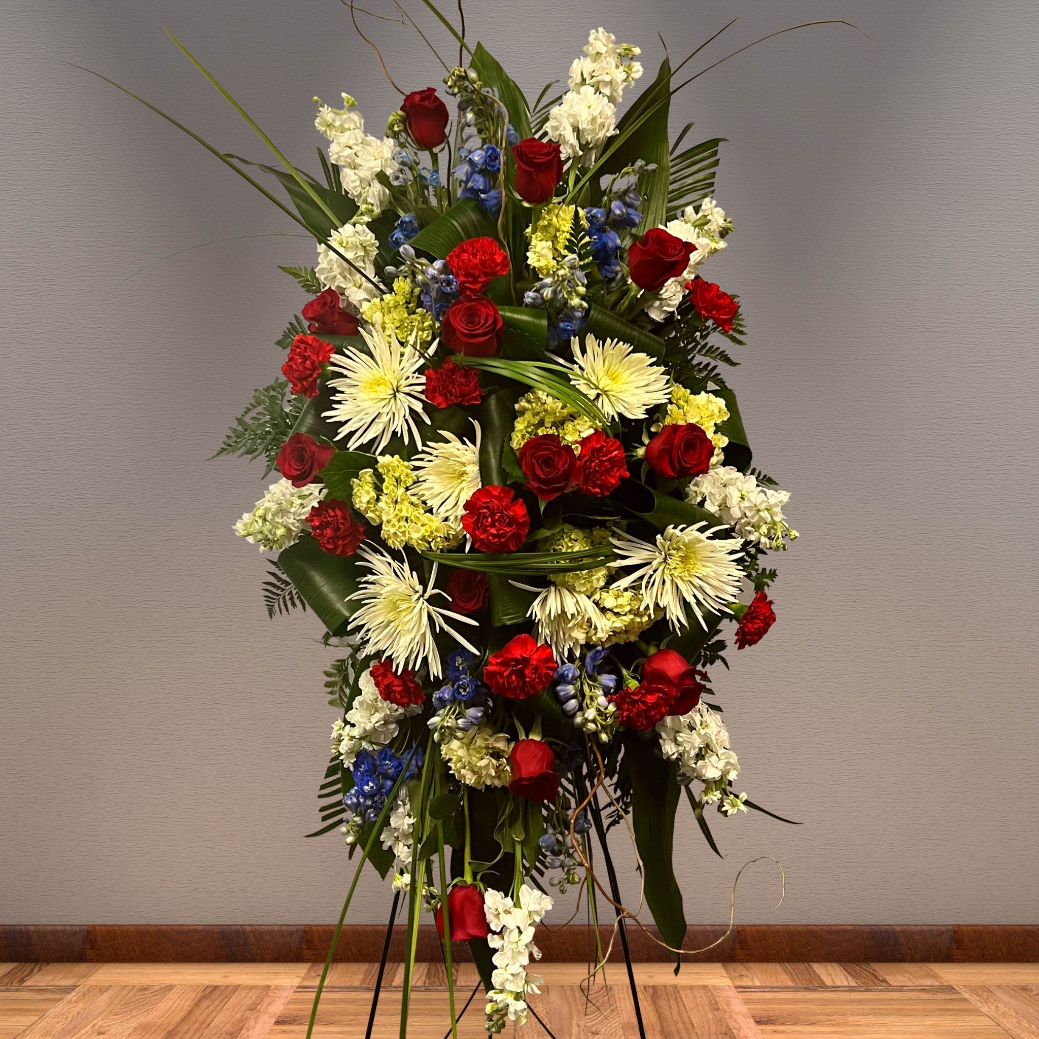 To send memorial flowers is a testament to compassion and graciousness. Honor a veteran with this red, white, and blue tribute of roses, delphinium, carnations, mums, sweeping grasses, whipping curly willow, and fireworks of White Mums.